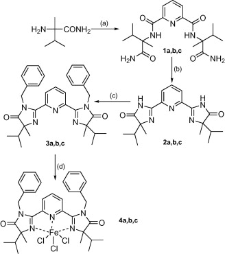 New ligands and their complexes with iron(III) chloride have been suggested and prepared: (R,S)-, (R,R)- and (S,S)-2,6-bis(1-benzyl-4-isopropyl-4-methyl-4,5-dihydro-1H-imidazol-5-on-2-yl) pyridines. Both the ligands and their complexes were characterised by 1H and 13C NMR spectroscopy, optical rotation and X-ray diffraction.