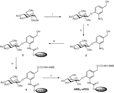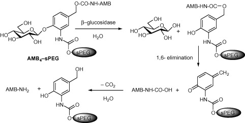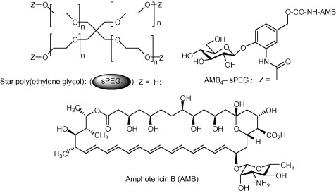 A new targeting potentially intravenous conjugate Amphotericin B (AMB)-star poly(ethylene glycol) (sPEG) (M = 25,160) has been synthesized and characterized. It contains a beta-D-glucopyranoside molecular switch which is sensitive to beta-glucosidases (E. C. 3.2.1.21). The beta-glucosidase-catalyzed release of AMB from the polymeric carrier was proved in vitro by means of spectrophotometry and HPLC. (C) 2008 Elsevier Ltd. All rights reserved.