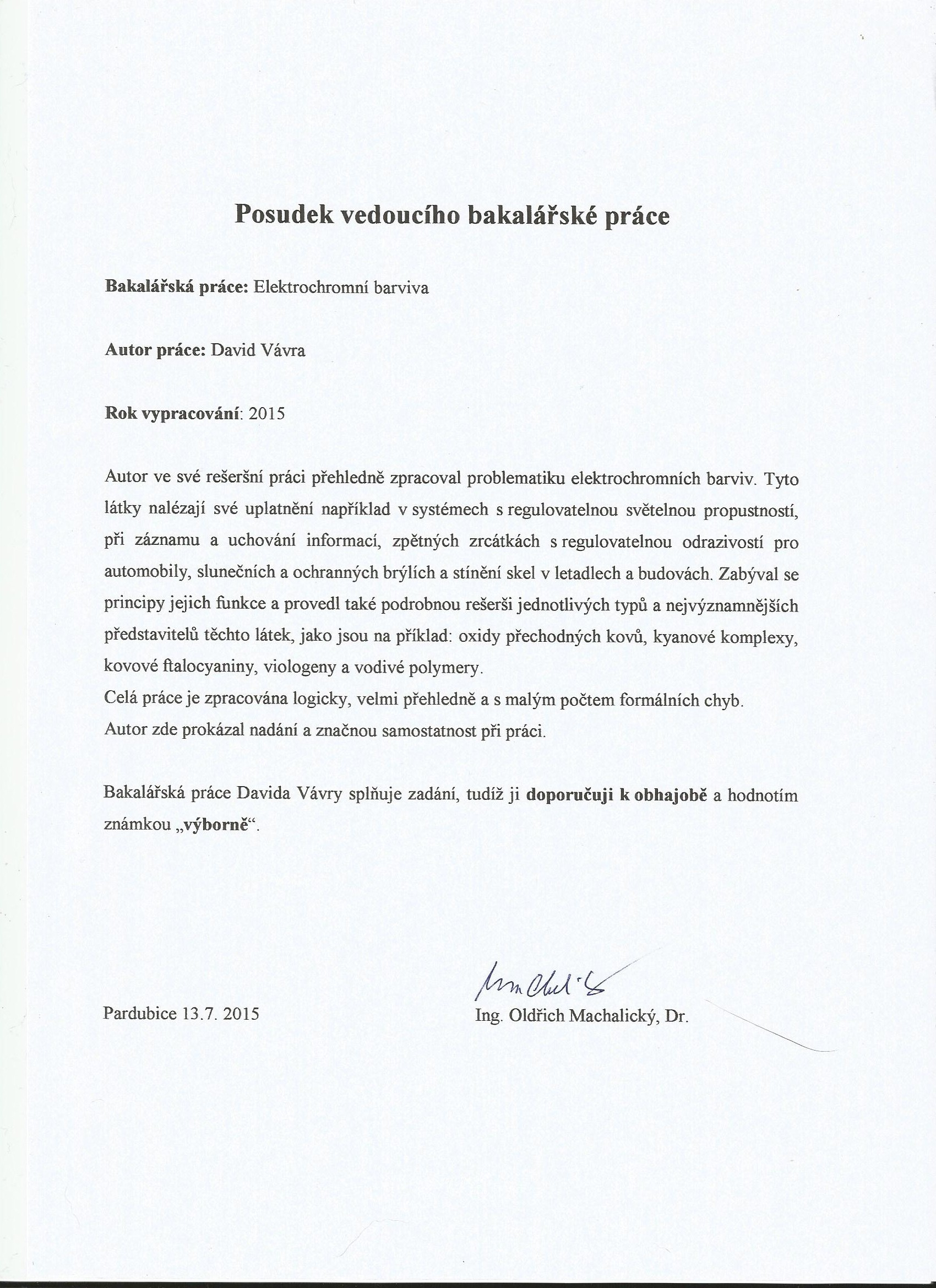 Tato práce se zabývá elektrochromními barvivy a jejich aplikací. Práce je rozdělena do dvou částí. První část je věnována obecně chromním jevům, elektrochromním systémům, jednotlivým skupinám barviv a aplikacím, druhá část práce je zaměřena na syntézy elektrochromních barviv.
