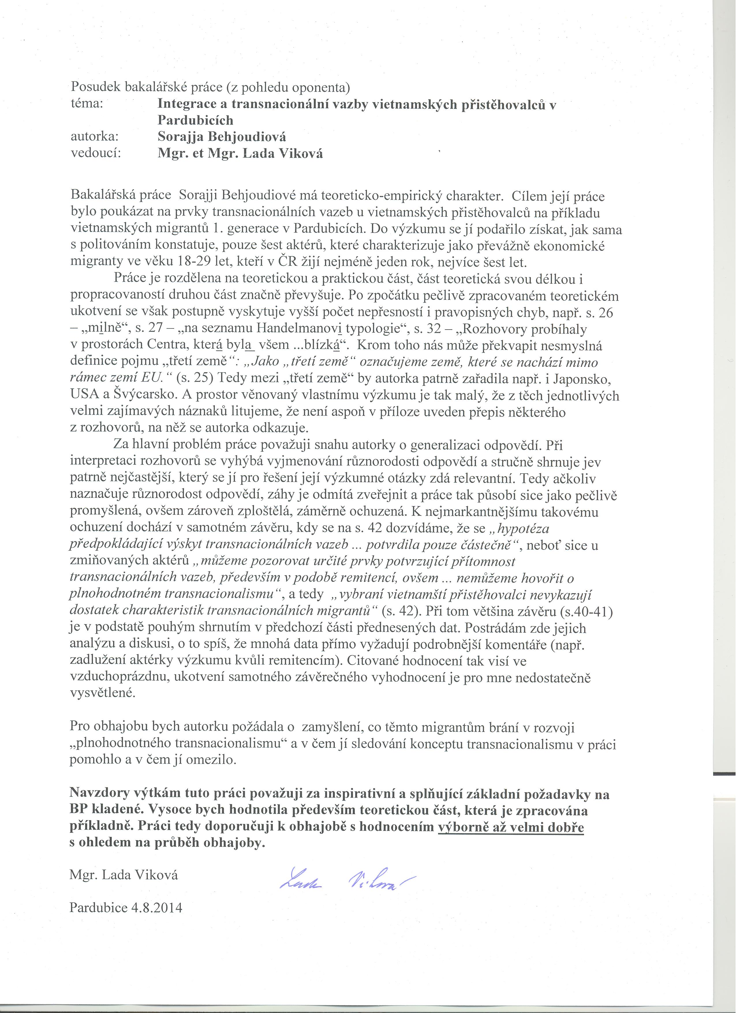 Bakalářská práce se zabývá transnacionálními vazbami vietnamských přistěhovalců v Pardubicích. V úvodní části stručně představuji historii migrace Vietnamců a jejich současnou situaci. Hlavní část věnuji konceptům teorie transnacnacionální migrace a integrace a ty pak komparuji s výsledky svého terénního výzkumu. Cílem je zjistit, zda vietnamští přistěhovalci vykazují určité aspekty transnacionálních vazeb a získat tak odpověď na otázku, zda li můžeme vietnamské přistěhovalce označit za transnacionální migranty.