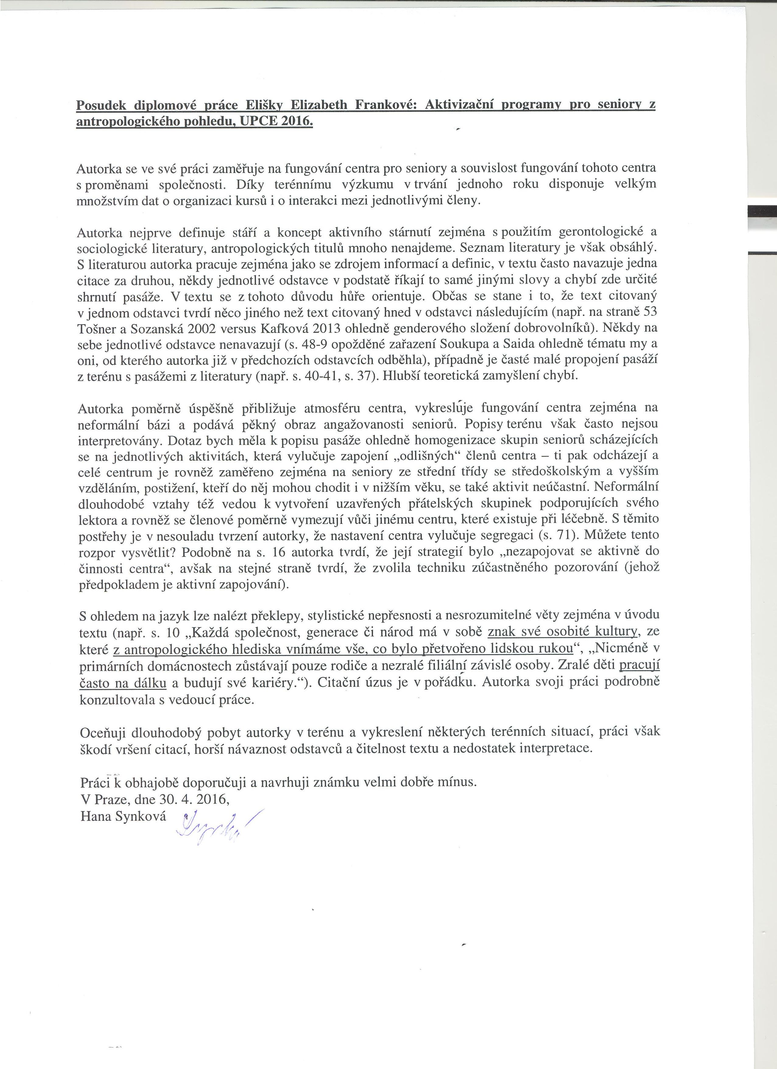 Diplomová práce s názvem Aktivizační programy pro seniory se na tyto programy dívá pohledem antropologa. V zorném úhlu jeho pohledu je především forma, jak jsou tyto aktivity realizovány a poskytovány seniorům na Praze 8. Cílem práce je zmapování vzájemných vztahů, se zaměřením na problematiku aktivního stáří a jak jsou tyto skutečnosti odrazem proměny společnosti v rámci demografického stárnutí populace. Práce vychází z vlastního terénního výzkumu za využití techniky zúčastněného pozorování. Na základě zjištěných skutečností se diplomová práce snaží analyzovat pojmy stáří, stárnutí, senior v kontextu aktivního naplnění života. Práce je příkladem dobré praxe aktivního stárnutí a zapojení seniorů do života komunity. Měla by přispět k vytváření aktivit na úrovni obcí a měst ve vztahu ke zlepšování kvality života seniorů.
